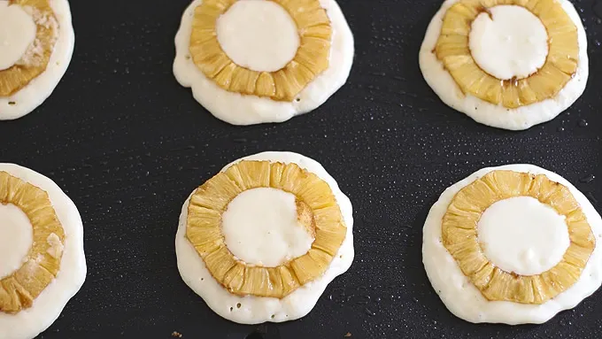Combine Bisquick™, milk, vegetable oil and eggs; stir until combined. Pour 1/4-cupfuls batter onto hot griddle, then top each pancake with a pineapple ring. Cook 3 to 4 minutes until bubbles form on the surface and edges are dry; flip and cook another 2 minutes until cooked through.