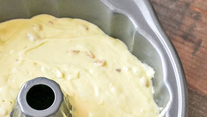 Step1Preheat the oven to 350°F. Pour the cake mix and 1 box pistachio pudding into a mixing bowl. Add in the eggs, vegetable oil, club soda and 1 teaspoon almond extract. Mix until combined, then fold in the walnuts.