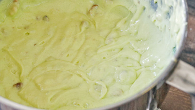Step3To make the frosting, whisk together the heavy cream, milk and almond extract. Add in 1 box pistachio pudding mix and continue to whisk on high until it thickens. Frost the entire cake or just the top!