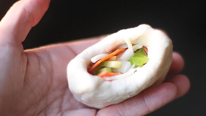 Step5Carefully tuck a pinch of cheese into the pocket of the biscuit, then add in a teaspoon or so or marinara sauce, then add in some pinches of your pizza toppings, top with a final pinch of cheese, then use your fingers to pinch together the dough to seal in the pocket. Be sure that it is well-sealed.