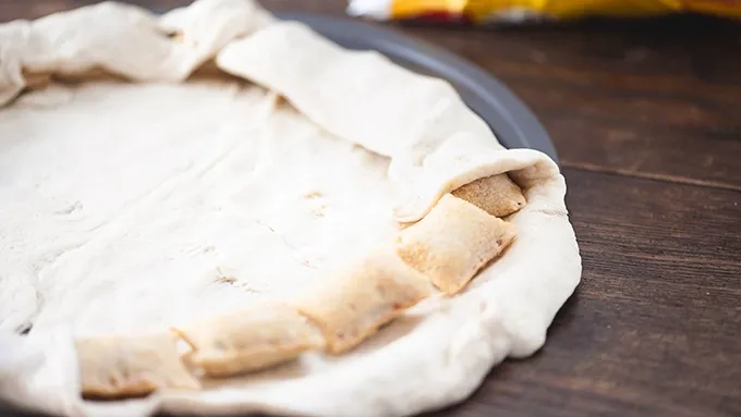 Place the pizza rolls around the edges of the pan and fold the extra crust up and over the pizza rolls.