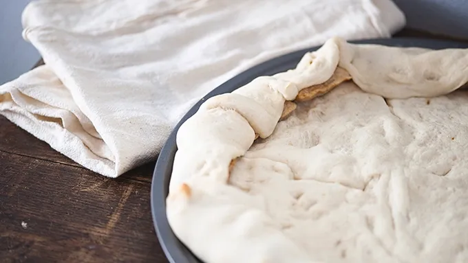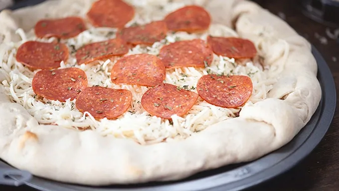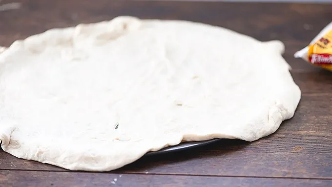 Remove the pizza crust from the packaging and press it into a round pizza pan, spreading it with your hands to leave a 1-inch gap hanging over the edges of the pan.