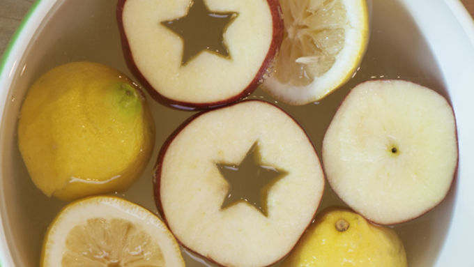 Step3Squeeze 2 lemons into about 3 cups of water, and dip the slices (not the glittery apple top though) into the lemon water to inhibit browning. Pat dry with paper towel.