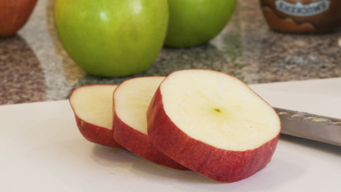 Step2Slice each apple into 3 horizontal slices. Keep the slices from each individual apple grouped together for orderly parfaits.