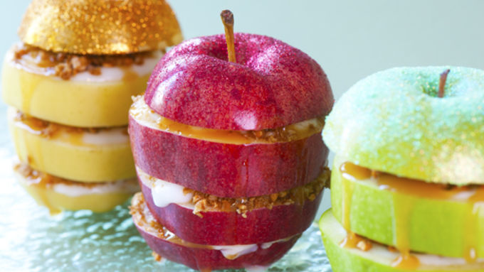 Apple slices, yogurt, granola bars with a drizzle of caramel and a little edible disco dust give these sweet treats an adorably "over the top" Snow White effect!