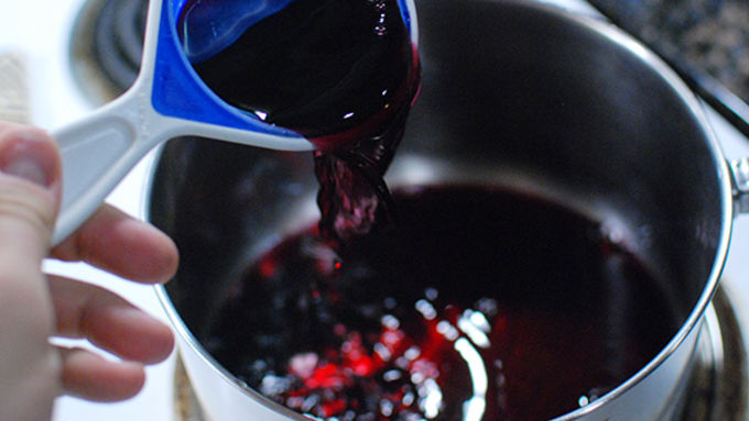 Step1Put the wine, juice, and sugar into a sauce pan on low heat. Heat and stir until starting to steam and sugar is dissolved, but do not bring to a boil. Whisk the salt and xanthian gum into the hot mixture. Allow to fully cool in the fridge.