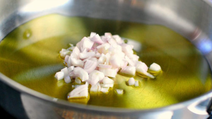 Step3Meanwhile add the 1/4 cup of olive oil into a deep 10-inch skillet and warm over moderate heat. Once the oil is hot, add the chopped shallots, stirring occasionally until softened.