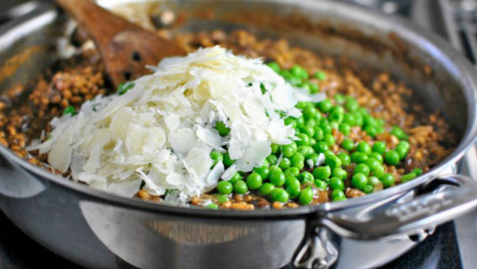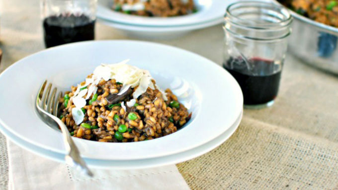Farrotto is similar to risotto but made with farro instead of rice and mixed with porcini mushrooms, peas, and parmesan cheese.