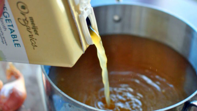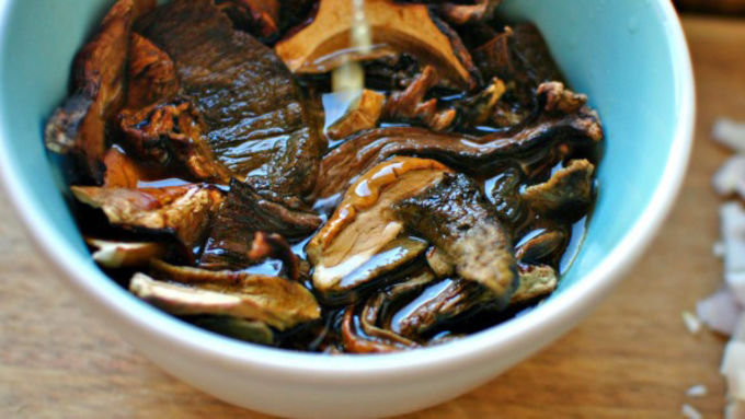 Step2In a small bowl add the dried mushrooms, and pour a cup or so of warm broth over the top of the mushrooms. Let sit for a few minutes. Drain the mushrooms, reserving the liquid for later us. Roughly chop the mushrooms.