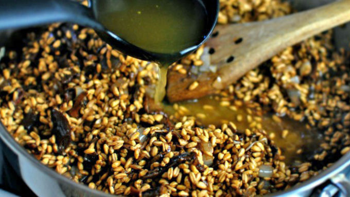 Step5Next, add a ladle of warm broth, stir until absorbed, and repeat until the farro is tender but still has a little bit of crunch.