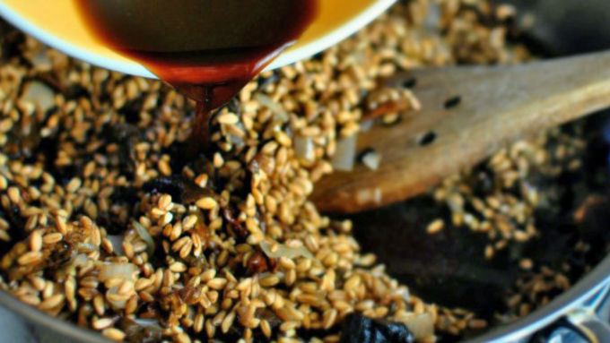 Step4Once the shallots are soft, add the chopped porcini mushrooms and the farro. Give it a stir and then pour in the reserved mushroom liquid. Stir and simmer until the farro has absorbed the liquid.