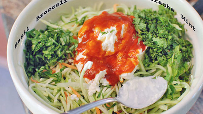 Step3While the belly is cooking, slice up your cucumber with either a julienne peeler or the shred attachment of a food processor. Mix the cucumber with the broccoli slaw and all the rest of the slaw ingredients. Season and mix well and allow to sit an hour before serving.