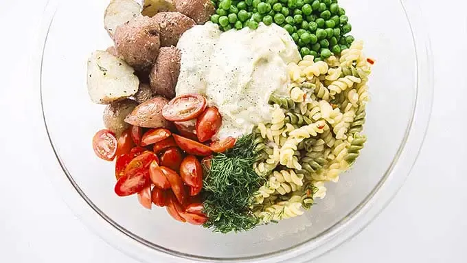 Step2Place pasta in a large serving bowl with potatoes, peas, tomatoes, bacon and dill.
