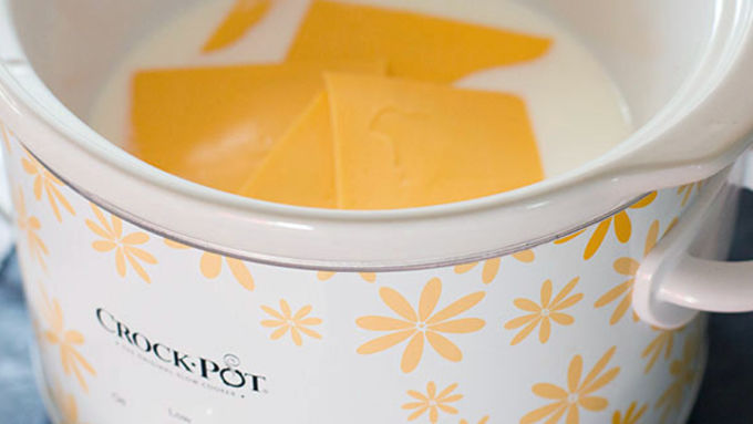 Step2During the last hour of pork cooking, start the cheese sauce in a second 3 to 4 quart slow cooker. Whisk together the milk and corn starch in the crock. Add the cheese slices to the crock. Cover and cook on high for 1 hour, or until the cheese is melted. Whisk together until smooth to make a cheese sauce.
