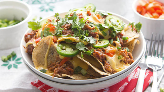 - There are regular run-of-the-mill nachos. Chips 'n cheese 'n blah 'n blah. And then there are PULLED PORK nachos. Heyyyyyy party animals! Pull out the team jerseys, paint your cheeks and fire up your slow cookers. It’s time for last-minute easy-peasy game day snackin', and we’ve got a dish so quick (and so wildly delicious!) you’ll feel like you’ve been recruited as MVP of Team Party Eats. These Pulled Pork Nachos are the ultimate snack to serve to a crowd. They’re familiar classics, but with a big ‘ol tasty twist. The best part? A couple of slow cookers, a few minutes of prep, and you’ll be feeding a big ol' cheering crowd in no time at all. Get a head start by grabbing a bag or two of Food Should Taste Good chips the next time you go to the grocery store. I love the olive or multigrain flavors, but you could also make the jalapeno or sweet potato varieties into the most delicious flavor combinations ever. You’ll also need two slow cookers. 3-4 quart (the small to medium-sized ones) make the ideal bake-n-serve size. When it’s time to party, place your slow cookers on a buffet table with bowls of green onions, cilantro, jalapenos, red peppers, and Food Should Taste Good chips. Invite party guests to pile everything high on a plate and customize their own portions. Serve with napkins and beer. This recipe it something worth cheering about!