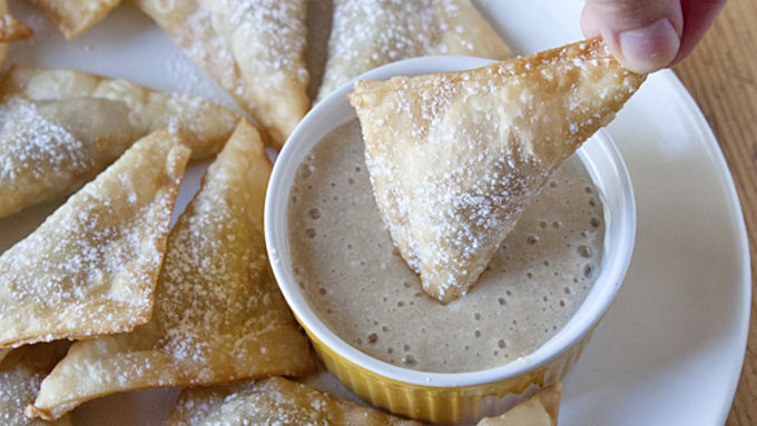 In a small bowl, whisk together powdered sugar, cream cheese, maple syrup and ground cinnamon. Serve dip alongside warm wontons.