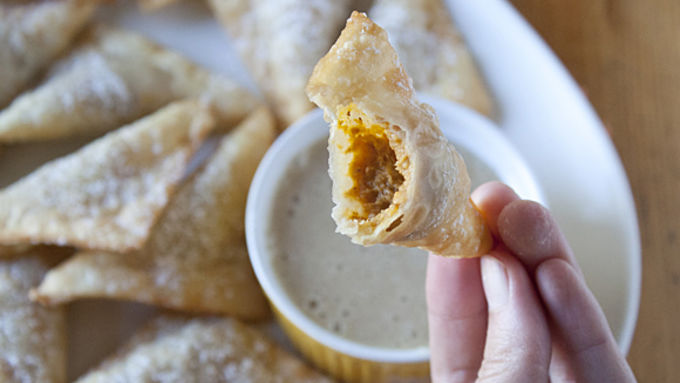 You may think this claim is outlandish, and I admit I thought the same when I first made a go of this recipe. “What could POSSIBLY be tasty about pumpkin-cream cheese filling wrapped up in a wonton fried to a light, crispy-brown goodness and then sprinkled with powdered sugar and dipped in a sweet maple sauce?” I asked myself. I mean—right? It was a mystery.