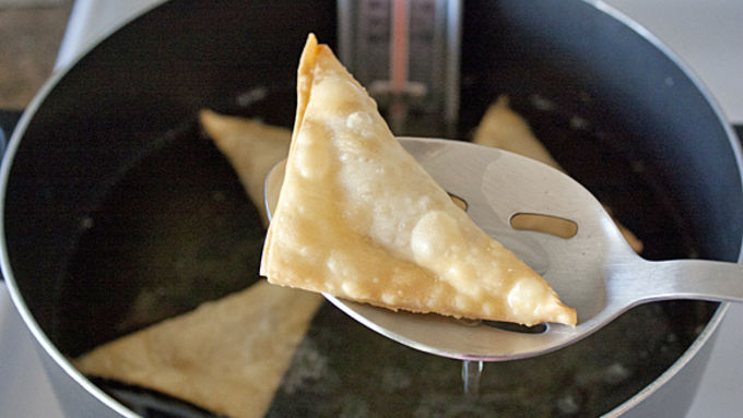 In a large, deep saucepan over medium heat, bring about 1 1/2 inches oil to 320°F (use a deep-fry or candy thermometer to measure temperature). Drop 3-4 wontons at a time into oil and cook 2-3 minutes each side until golden brown.