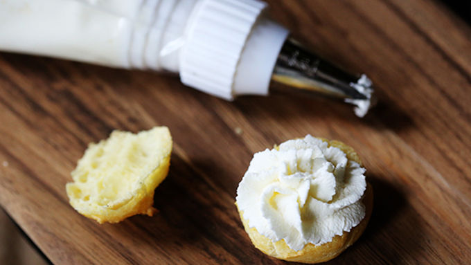 Step3Meanwhile, using an electric mixer, beat the heavy cream and powdered sugar together on medium-high speed until stiff peaks form. Use a piping bag or a spoon to place a dollop of the whipped cream on the bottom half of each puff.