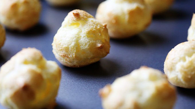 Step2On ungreased cookie sheet, drop dough by tablespoon fulls at least 2 inches apart. Bake 18-22 minutes or until puffed and golden. Remove and let cool completely. Then use a knife to slice each puff horizontally.