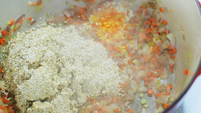 Step2In a medium sauce pot or dutch oven, cook the carrot, celery, and onion in a little oil for 10 minutes. Add the garlic and the quinoa and cook for about 10 minutes stirring often. You want to lightly toast the quinoa but not burn the garlic or other veggies.