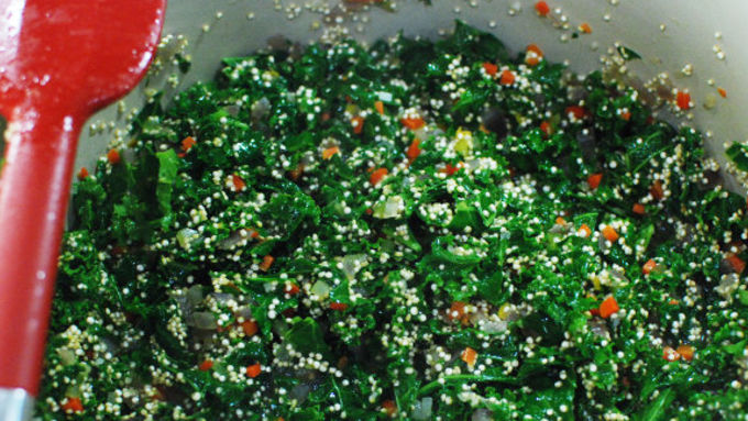Step1Chop all the veggies. Remove the kale from the stems and chop very small. Clean and prep the shrimp. Rinse the quinoa really well.