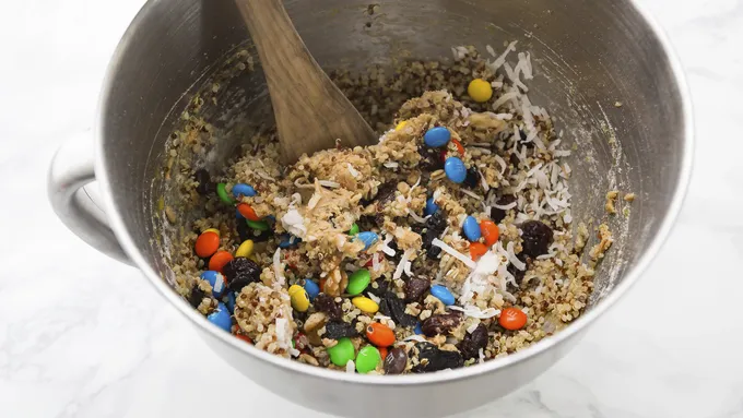 Stir in quinoa, coconut, nuts, cranberries and M&M’s™.