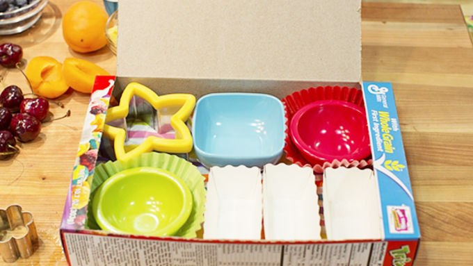 Step1Place small bowls, cookie cutters or paper baking cups in box or lunch container.