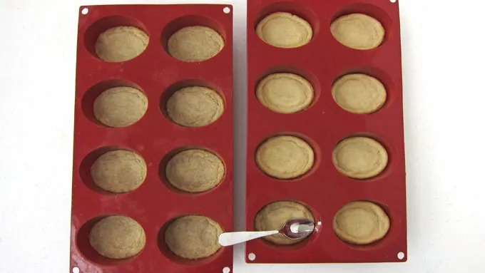 Step2Spoon 2 teaspoons of dough mixture into 2 silicone molds (with 8 oval-shaped cavities each). Press dough mixture into an even layer and bake for 10 minutes.