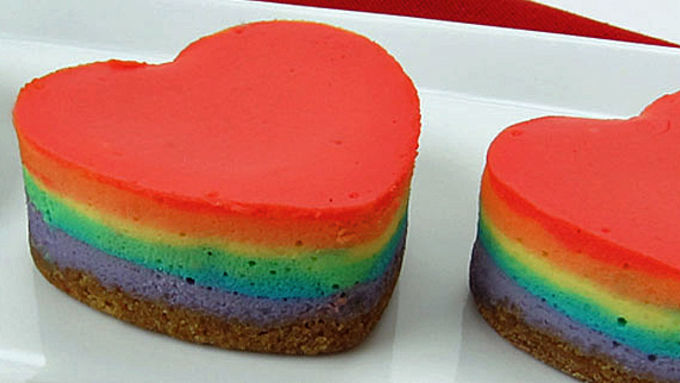 - Valentine's Day comes during a gloomy and gray month, so why not brighten it up a bit by making and serving these rainbow cheesecake hearts. Each individual sized serving of rich creamy cheesecake has six colorful layers. You don't even have to dig your spoon into a cake to see all the wonderful colors, they show up beautifully around the sides of each heart. This Rainbow Heart-Shaped Cheesecake recipe is really fun to create, but takes a bit of patience and requires some heart shaped silicone molds or any shape mold you'd like to use. Just like any cheesecake you'll start with a graham cracker crust which is topped with individual layers of purple, blue, green, yellow, orange, and red cheesecake. When making the cheesecake filling you don't want a lot of air in this mixture, so I don't recommend using a hand mixer. Once baked, chilled and un-molded, these cakes can be served not only for Valentine's Day, but also for wedding or baby showers, birthday parties, or even tonight's dessert. Rainbow-licious!
