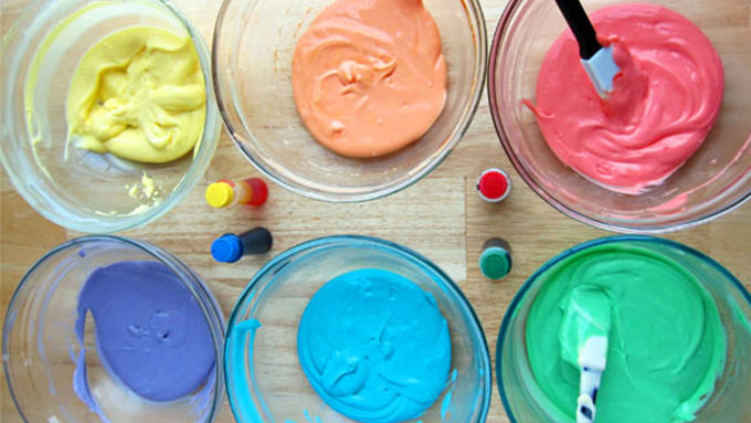 Step3Evenly divide cheesecake filling into six bowls, about a half a cup in each. Color one bowl with yellow food coloring then the others with orange, red, green, blue and purple. Start with one drop of coloring, then add more until you achieve the desired color. To get orange, use red and yellow, for purple, use red and blue.