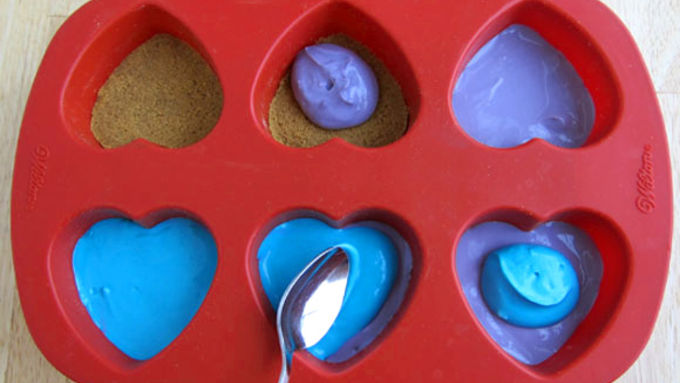Step4Equally divide the purple cheesecake filing among the 9 heart cavities, spooning about a tablespoon of the filling over each crust. Spread it out in a thin layer making sure it touches the sides of the mold completely. Wipe off any filling that smeared on the sides of the mold. Repeat this process with the blue, spreading it in an even layer over the purple. Repeat this process layering all the colors in the mold. Top the blue with green, then yellow, orange and finally red.