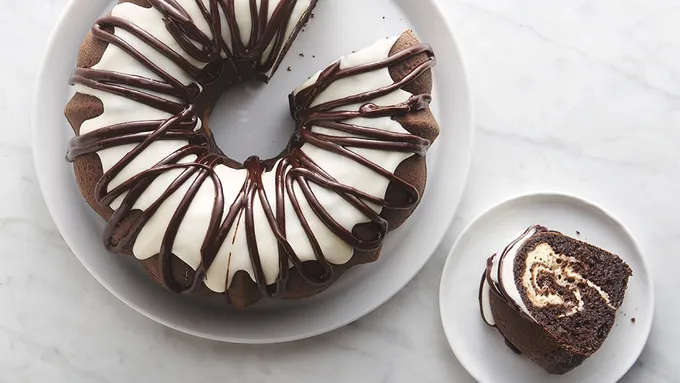 Brightly colored cake is swirled with a layer of cheesecake.