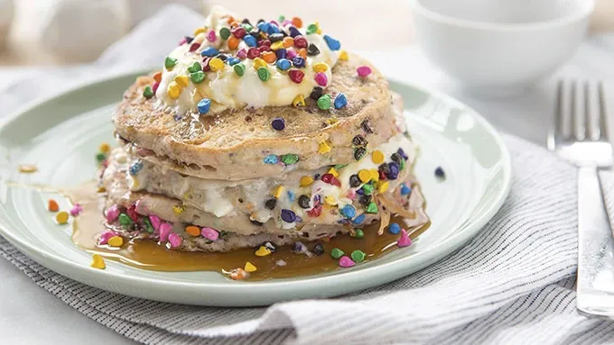 Rainbow chips are stirred into fluffy pancake mix, then topped with a Rainbow Chip butter so melty and good, you may just want to eat breakfast for dinner every night.