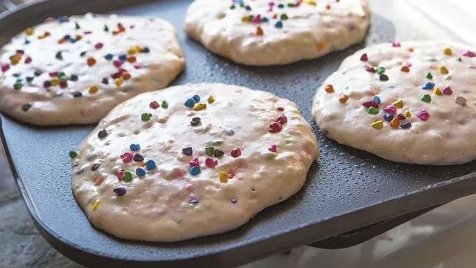 Step2In a large bowl, whisk together pancake mix and water until well combined. Fold in rainbow chips, leaving 1 tablespoon out for garnishing.
