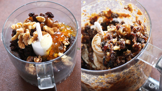 Step4To make the filling, process the figs, dates and raisins in a food processor until coarse. You can also chop them by hand if you don't have a food processor. Place chopped figs, dates and raisins in a bowl. Add remaining filling ingredients and mix well (mixture will be thick). Set mixture aside.