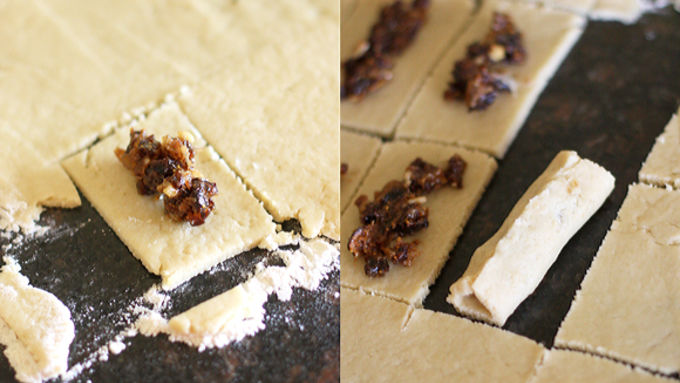Step5Preheat oven to 375°F. Work with one piece of dough at a time, leaving the other pieces of dough in the refrigerator until needed. On a floured surface (I often use confectioner's sugar for rolling my dough), roll the dough to a 12-inch square. Cut dough into 2x3-inch rectangles. Spoon about 1 teaspoon of filling onto each rectangle. Carefully fold the long edges over to meet in the center and pinch to seal seam, leaving the ends open.