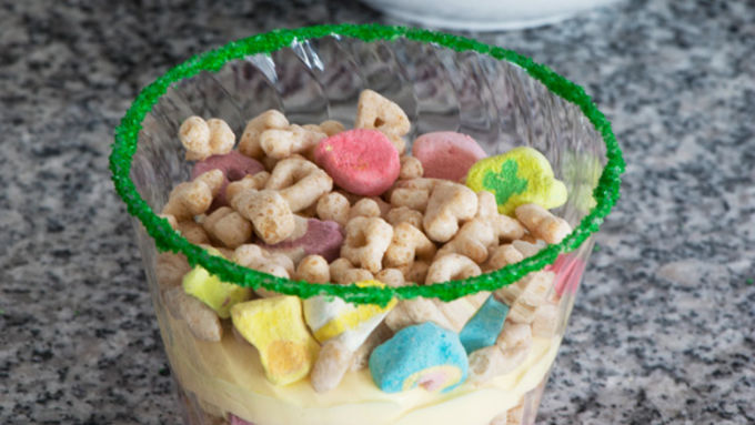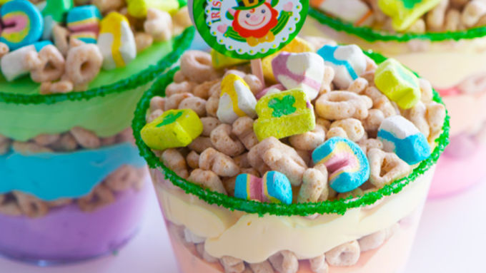 - I should call these “lucky day” dessert shooters. And it’s not for the obvious reasons. Before we get down to all things shamrock-y for these Rainbow Dessert Shooters, I want to impart a sweet little secret that allows me to stave off late-night ice cream and cream-pie cravings. Two little words: yogurt and whip. Mix up your favorite flavor of Yoplait light yogurt (vanilla, key lime pie, etc.) 50/50 with some reduced calorie whipped topping. Add a tablespoon or so of your fave yummy-but-highly-caloric-granola, and there you have it. Sweet, creamy, crunchy – but you can even add a berry or two or a tablespoon of mini chocolate chips to cover all the dessert bases. Best of all, the concept is highly customizable – add a green sugar rim, a little food coloring, and swap out the granola for a more holiday appropriate Lucky Charms, and it’s an adorable little St. Patty’s Day treat! Here’s a tip to make these extra special: make little holiday flags. I have friends who make elaborate, embellished personalized flags for their desserts – something I find so impressive! But I personally don’t have the time or the scrapbooking equipment. Cute stickers from my local craft store are a fun, easy substitute. Just sandwich the pointy end of a toothpick in between two identically shaped stickers, and there it is – a tiny flag! These little guys are best when assembled shortly before serving – maybe an hour or so. Otherwise the cereal can get a little soggy. Before serving, top each parfait with a little flag, and get ready to enjoy a 9 oz helping of rainbow-y dessert-y good fortune!