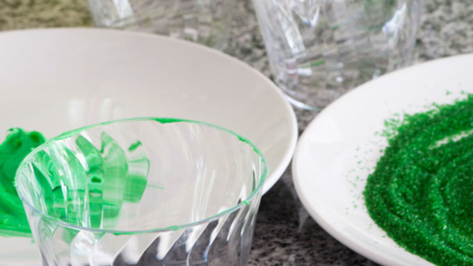 Step1Sugar the rims of the glasses. Leftover white frosting (color it green first), an orange or lemon slice, or water can be used on the rims to make the sugar adhere. Set aside.