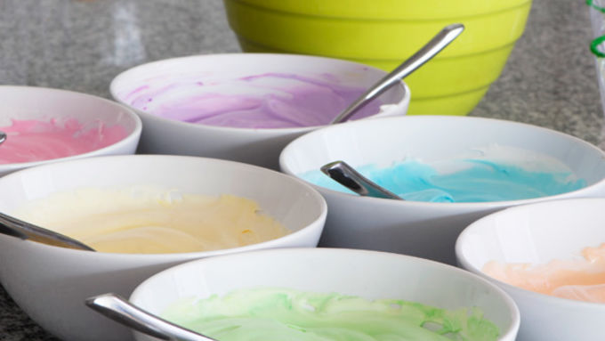 Step3Color with liquid food coloring. (4 to 6 drops per bowl.)