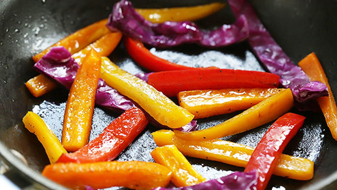 Step1Heat oil in a large skillet over medium high heat. Add bell peppers and saute for 5 minutes or until tender. Stir in cabbage and cook for an additional 2 minutes. Then stir in spinach and remove pan from heat.