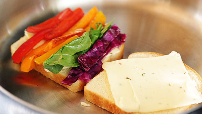 Step3Return pan to heat over medium low, and add the four slices of bread butter-side down to the pan. Place a slice of cheese atop each of the pieces of bread. Then layer the peppers, spinach and cabbage in a row in the colors of the rainbow on the other 2 slices of bread.