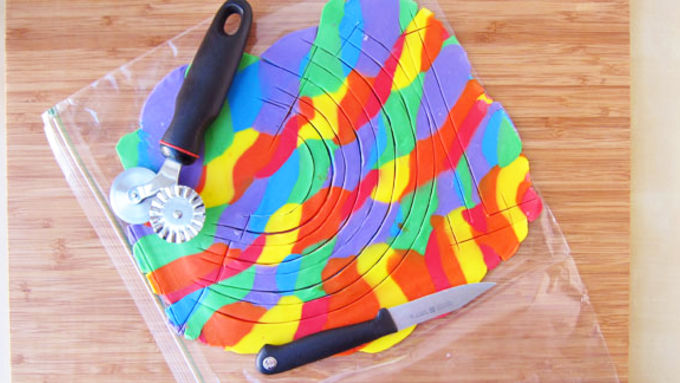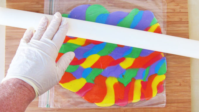 Step5Press down on the twisted rolls, pinching them together as needed, until you have a nice flat piece of colorful fondant. Fold over the plastic zip top bag, setting it on top of the fondant. Use a rolling pin to further flatten out the rainbow of fondant. Roll it out to about 1/8th inch thickness. Allow to sit for 5 minutes, then peel off the top of the bag.