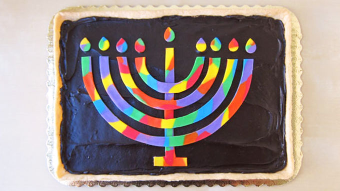 - Light up your Hanukkah dinner table with a rainbow menorah-topped cookie. This Pillsbury Sugar Cookie is frosted with creamy Betty Crocker frosting and decorated with colorful fondant or modeling chocolate. The simple shapes of the menorah are easy to cut out of fondant, and come together to create a beautiful symbol of the holiday season. Serve and enjoy! You can store it at room temperature for up to two days. Happy Hanukkah!