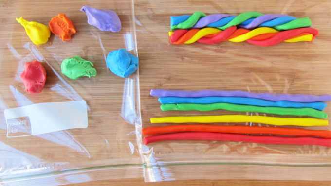 Step4Cut a gallon size zip top bag along two sides. Lay it open on your work surface. Pinch off 1 tablespoon of each color fondant. Roll into a long thin log. Press together a yellow, orange and red log. Twist a few times then set it on one side of the opened zip top bag. Do the same with some green, blue and purple. Set this log up against the first one. Repeat, creating a total of 6 twisted logs.