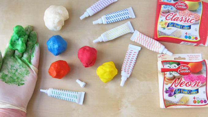 Step3Wearing food handling gloves, pinch off about 3 ounces (3 tablespoons) of white fondant or modeling chocolate. Add drops of red Betty Crocker™ Gel Food Coloring and knead it in, adding more coloring until you reach the desired shade of red. Repeat, coloring fondant or modeling chocolate orange, yellow, green, blue and purple.