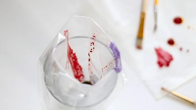 Step3Fold top of decorating bag over to form a cuff and place bag in a tumbler. With paint brushes, paint lines of food coloring inside bag from tip to top, just below where cuff starts to fold. The lines will look a little watery and beaded. Gently scoop meringue into bag and twist the top closed.