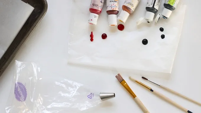 Step1Preheat oven to 200°F and line a baking tray with parchment paper. Prepare a disposable decorating bag fitted with a round size 12 tip (both can be found at craft stores). On a piece of wax paper, place a couple drops of each color of gel paste food coloring. Have some paint brushes ready. Set all this aside.