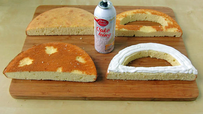 Step6Pipe Betty Crocker™ Cake Icing onto one side of a cut-out cake. Place the flat side of one whole cake on top of the icing. Pick up the stacked cakes and turn it upside down, so that the whole cake is now on the bottom and the cut-out cake is on top. Pipe icing along the edge of the cut-out cake, and carefully pick up the other cut-out cake and set it on top.