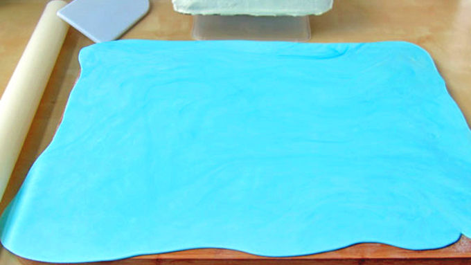 Step10Color 16 ounces of fondant light blue. This will be the sky and it looks good with streaks of darker blue throughout, so there's no need to completely mix the coloring into the fondant. Once you're done coloring the fondant light blue, lightly grease a cutting board or counter with shortening and roll out the fondant into a large rectangle.
